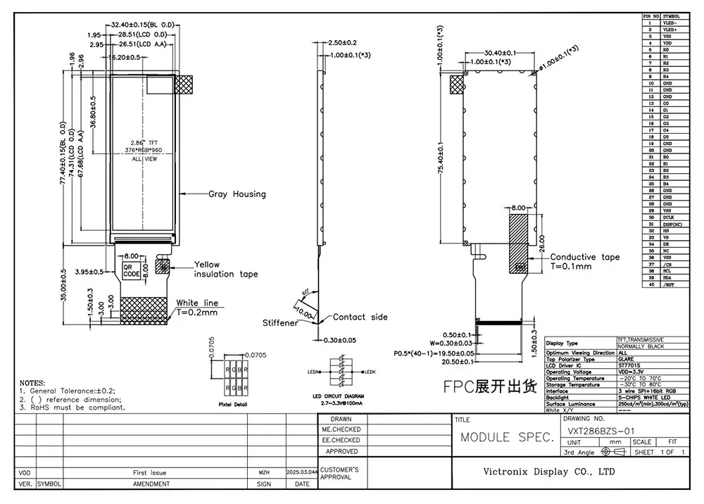 У епоху інтелекту модуль TFT дозволяє нам представляти необхідні дані візуально. Якість модуля TFT має критичний вплив на його застосування. Які переваги Victronix 2,86 дюйма 376 × 960 IPS TFT модуль? Спочатку його 300 CD/м² яскравість, співвідношення контрасту 1500: 1, кут огляду 85 градусів у всіх напрямках та 80% рівномірність забезпечують яскраві зображення. По-друге, він підтримує інтерфейс RGB SPI+16-біт RGB з ST7701, і 5-порожній білий світлодіодний підсвічування з від 30 000 до 50 000 годин, забезпечуючи його довгострокову зручність використання в різних промислових програмах. Крім того, він відповідає стандартам ROHS і успішно проходить суворі випробування надійності, включаючи тепловий удар, вологість та захист ОУР до 8 кВ повітря та контакт 4 кВ. Цей продукт працює ефективно в екстремальних температурах від -20 ° С до +70 ° С і може протистояти важких умовах зберігання від -30 ° С до +80 ° С.
