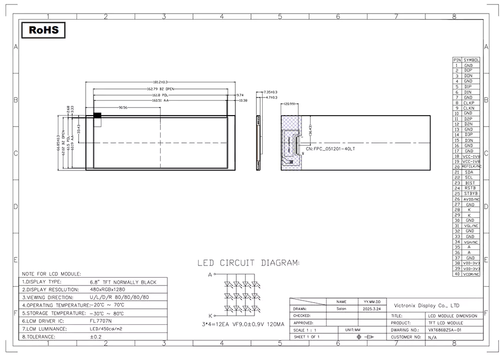 TFT LCD-це тип рідкокристалічного дисплея, який використовує технологію тонкої фільму транзистора для підвищення якості зображення, і він має численні програми в повсякденному житті. Як професійний виробник модуля TFT в Китаї, що робить Victronix 6,86 дюйма 480 × 1280 IPS TFT модуль відмінним від інших виробників? Спочатку він пропонує типову яскравість 450CD/м², 16,7 м кольорів, широкий кут огляду 80 ° (типовий) у всіх напрямках та співвідношення контрасту 800: 1, що забезпечує відмінну читабельність з різних кутів. По -друге, він інтегрує блок підсвічування, використовуючи 3 × 4 білі світлодіоди з типовим терміном життя від 30 000 до 50 000 годин (до 50% початкової яскравості), забезпечуючи чітку видимість у всіх умовах освітлення. Крім того, він використовує 4-смуговий інтерфейс MIPI DSI для швидкісної передачі даних та спрощеної інтеграції. Крім того, він проходить суворі тестування на навколишнє середовище, включаючи високе/низьке температуру зберігання та експлуатацію, температуру циклу, вологе тепло (вологість) тестування, щоб він міг безперешкодно працювати в межах розширеного температурного діапазону від -20 ° C до +70 ° C.