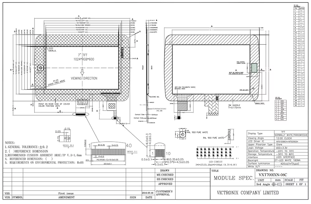 У епоху інтелекту модуль TFT дозволяє нам представляти необхідні дані візуально. Якість модуля TFT має критичний вплив на його застосування. Які переваги Victronix 7 -дюймовий 1024 × 600 Звичайний модуль білого TFT LCD? Спочатку він використовує 420 CD/M² високої яскравості з найкращим кутом перегляду під 12 годин для яскравих, точних візуальних зображень. По-друге, він підтримує інтерфейс LVDS з NT5100BCH+NT52002H Драйвером ІС та 27 підсвічуванням, що під керівництвом, з тривалою тривалістю 50 000 годин, забезпечуючи його довгострокову зручність використання в різних промислових програмах. Крім того, він відповідає стандартам ROHS і успішно проходить суворі випробування надійності, включаючи тепловий удар, вологість та захист ОУР до 8 кВ повітря та контакт 4 кВ. Цей продукт ефективно працює в екстремальних температурах від -20 ° С до +70 ° С.